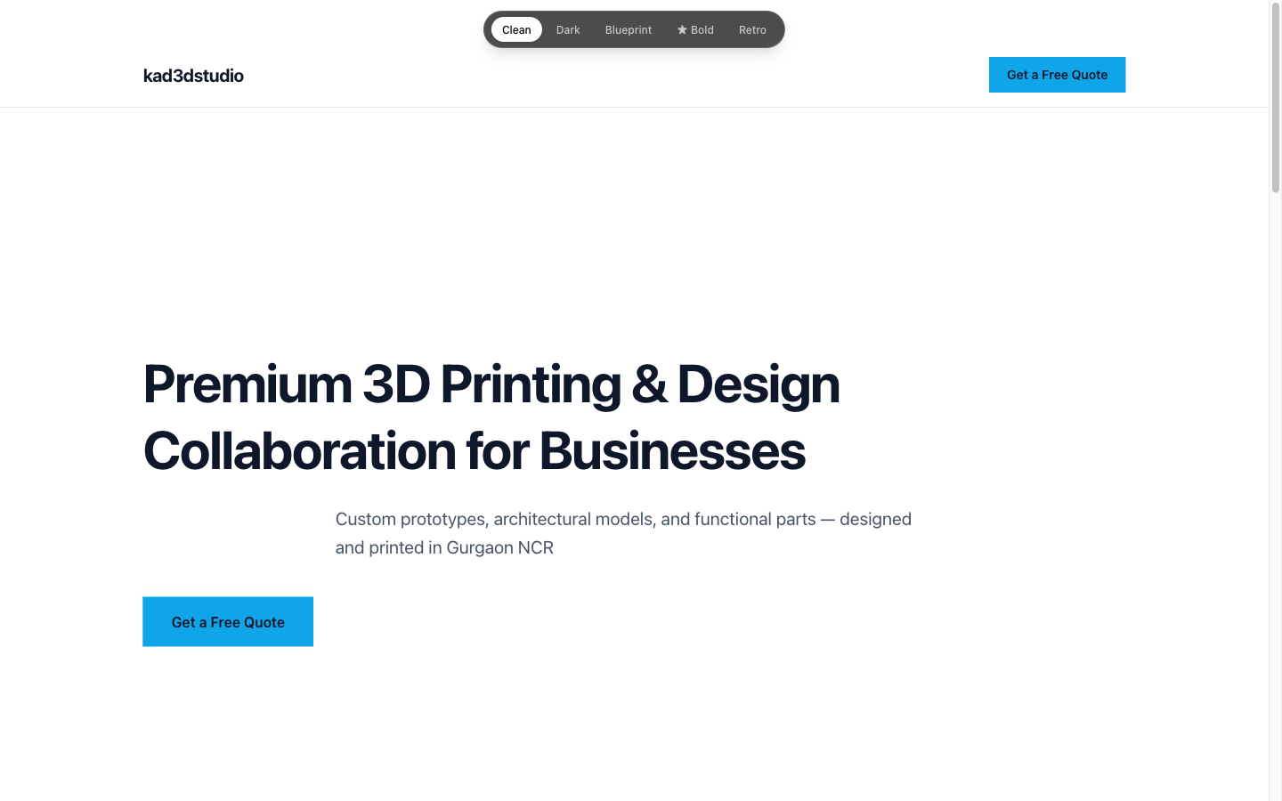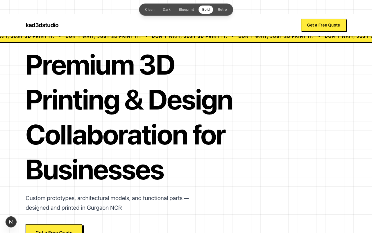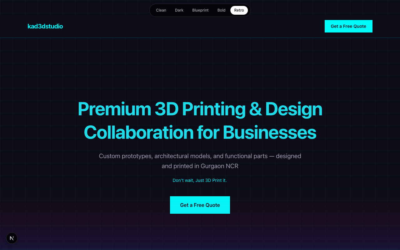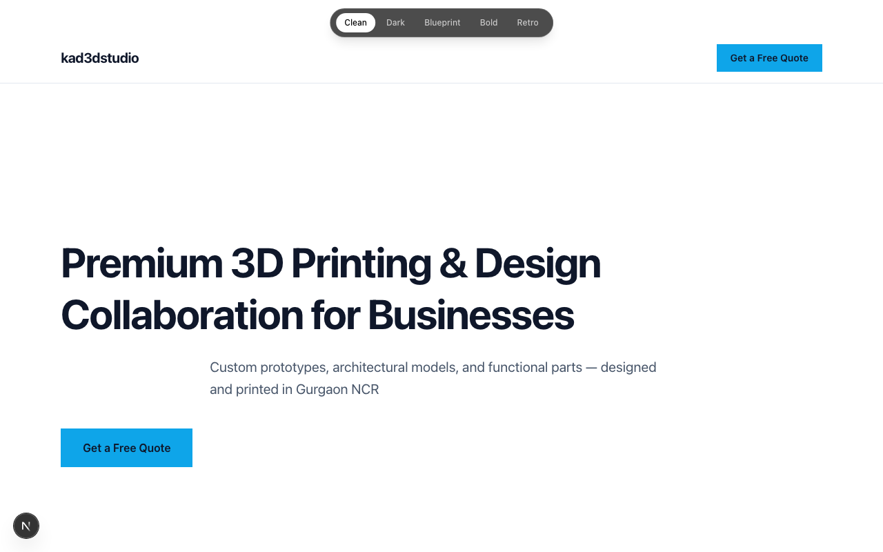 kad3dstudio — a 3D printing and design collaboration studio in Gurgaon, NCR. They work with businesses needing rapid prototypes, architectural scale models, and small-batch production runs: the kind of client who has a concept and needs a physical object in their hands fast. The brief was clear: a landing page that communicates that value, brings in inquiries, and gives them a professional presence to point people to. Nothing technically complex. Standard scope.