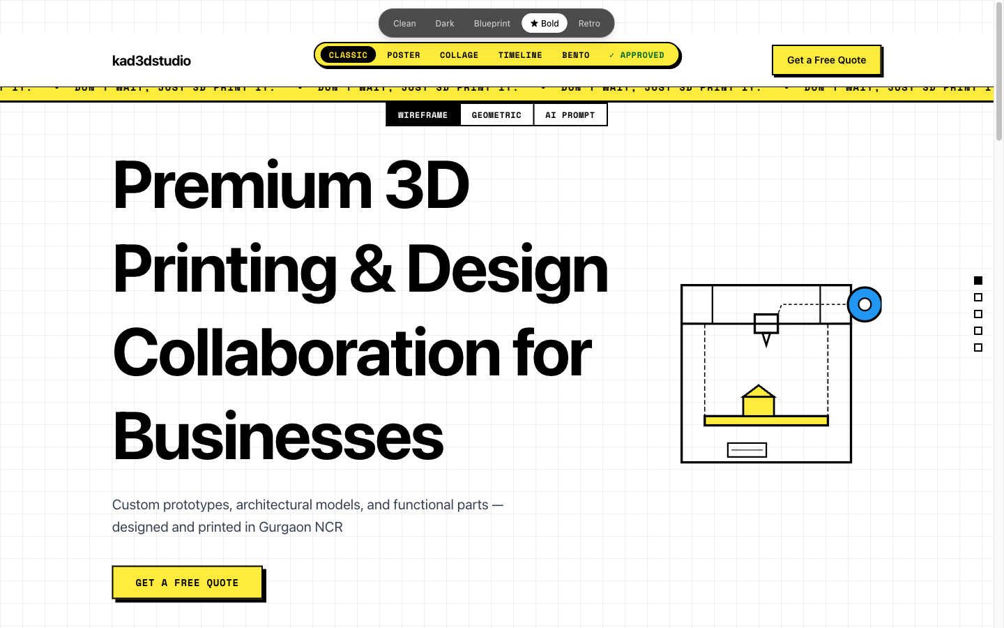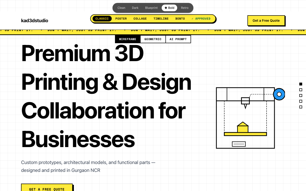 Bold won. And the reason made sense the moment it was said out loud: neubrutalism is industrial. It's confident. It's physically assertive — which is exactly the feeling you want from a company whose product is a machine that extrudes molten plastic into solid objects. Clean felt too SaaS startup. Dark felt like a cybersecurity firm. Blueprint was compelling but too niche. Retro was fun for about thirty seconds.