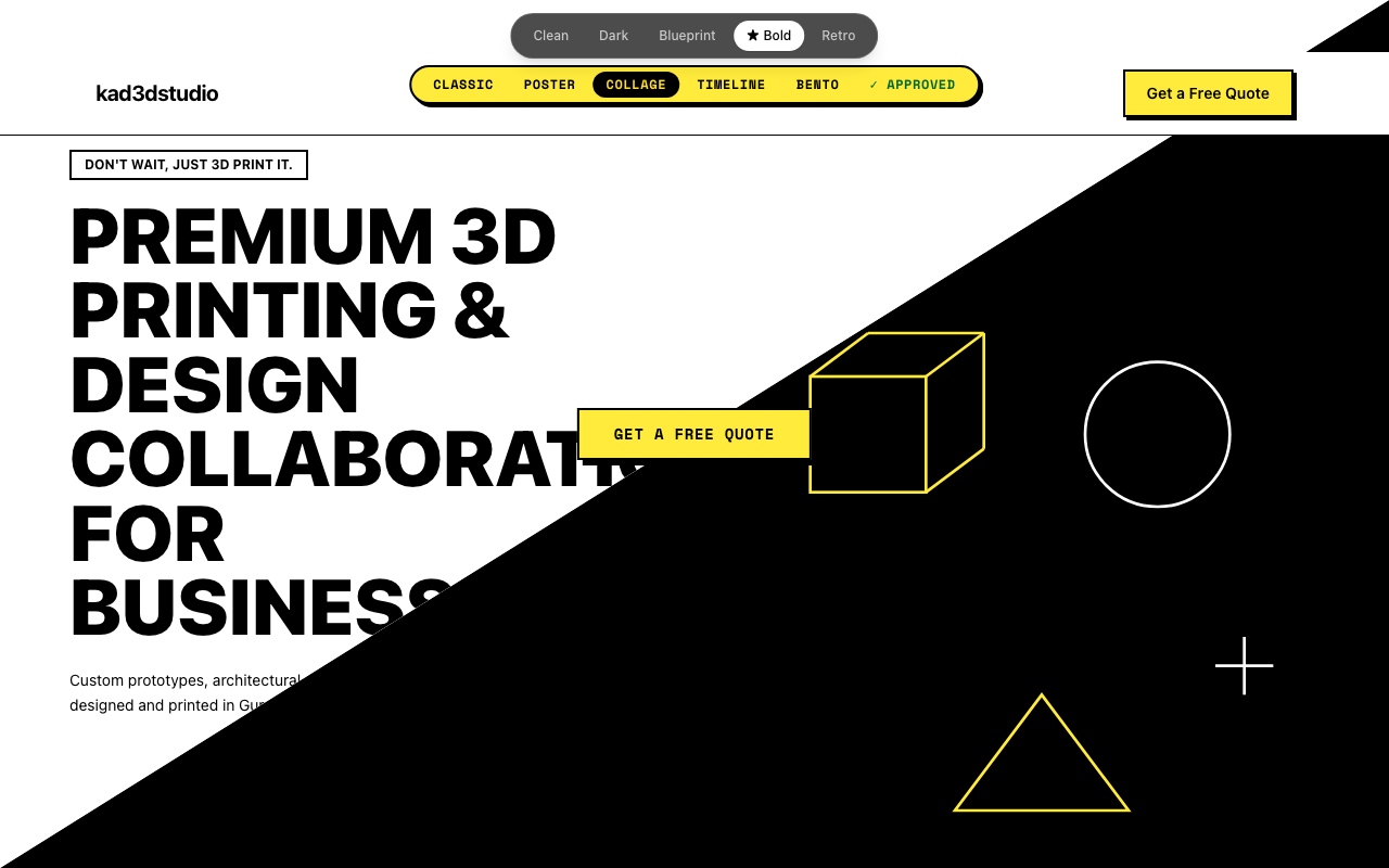 The full iteration showcase — all five themes and all five Bold variations — is live at kad3d-showcase.vercel.app. Click through everything.